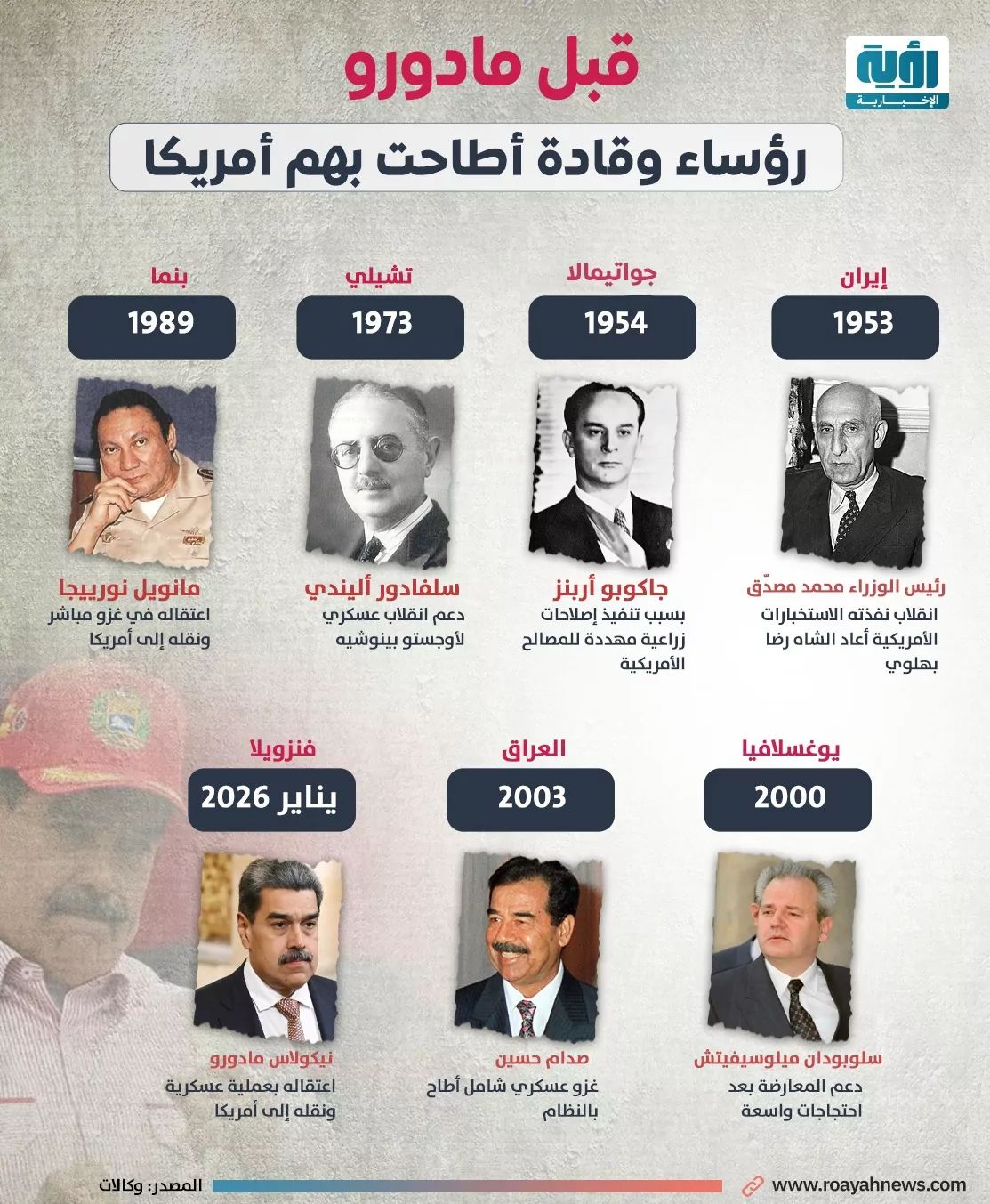 أثار اعتقال الرئيس الفنزويلي نيكولاس مادورو وإزالته بالقوة الأمريكية جدلًا واسعًا، باعتباره امتدادًا مباشرًا لتاريخ طويل من التدخلات الأمريكية لإسقاط رؤساء وحكومات لا تتوافق سياساتهم مع مصالح واشنطن، خصوصًا في أميركا اللاتينية والعالم الثالث.