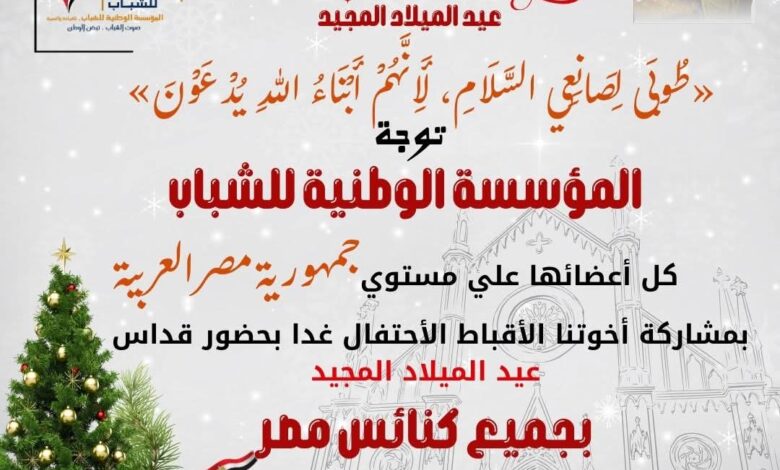 * في ضوء توجيهات فخامة الرئيس عبد الفتاح السيسي بتوحيد الصف الوطني وتعزيز قيم المواطنة، أعلنت المؤسسة الوطنية للشباب توجيهها لكافة أعضائها على مستوى جمهورية مصر العربية للمشاركة في احتفالات عيد الميلاد المجيد، من خلال التواجد بالكنائس كلٌّ في نطاقه الجغرافي، وبما يليق بقدسية المناسبة.