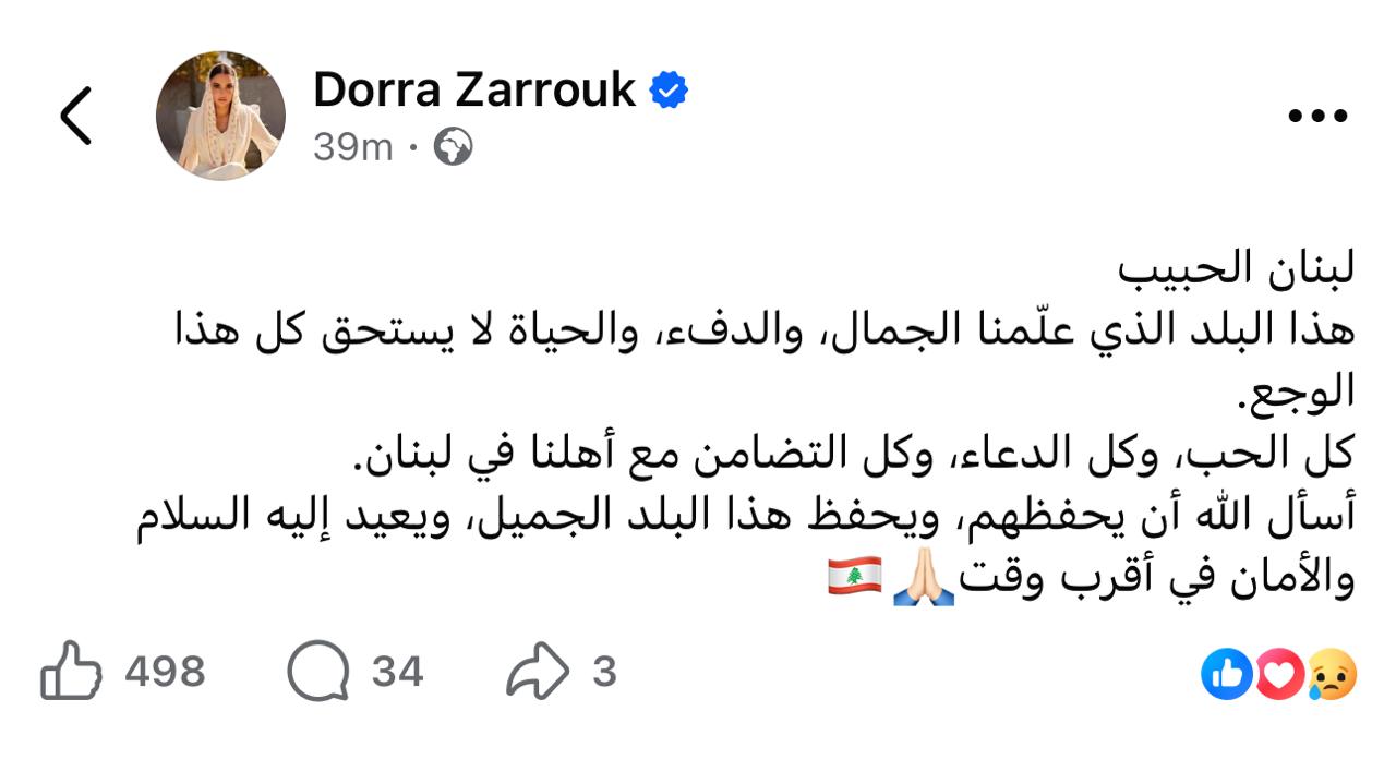 ونشرت درة عبر حساباتها على مواقع التواصل الاجتماعي رسالة مؤثرة قالت فيها:”لبنان الحبيب.. هذا البلد الذي علّمنا الجمال، والدفء، والحياة لا يستحق كل هذا الوجع.. كل الحب، وكل الدعاء، وكل التضامن مع أهلنا في لبنان.. أسأل الله أن يحفظهم، ويحفظ هذا البلد الجميل، ويعيد إليه السلام والأمان في أقرب وقت”.