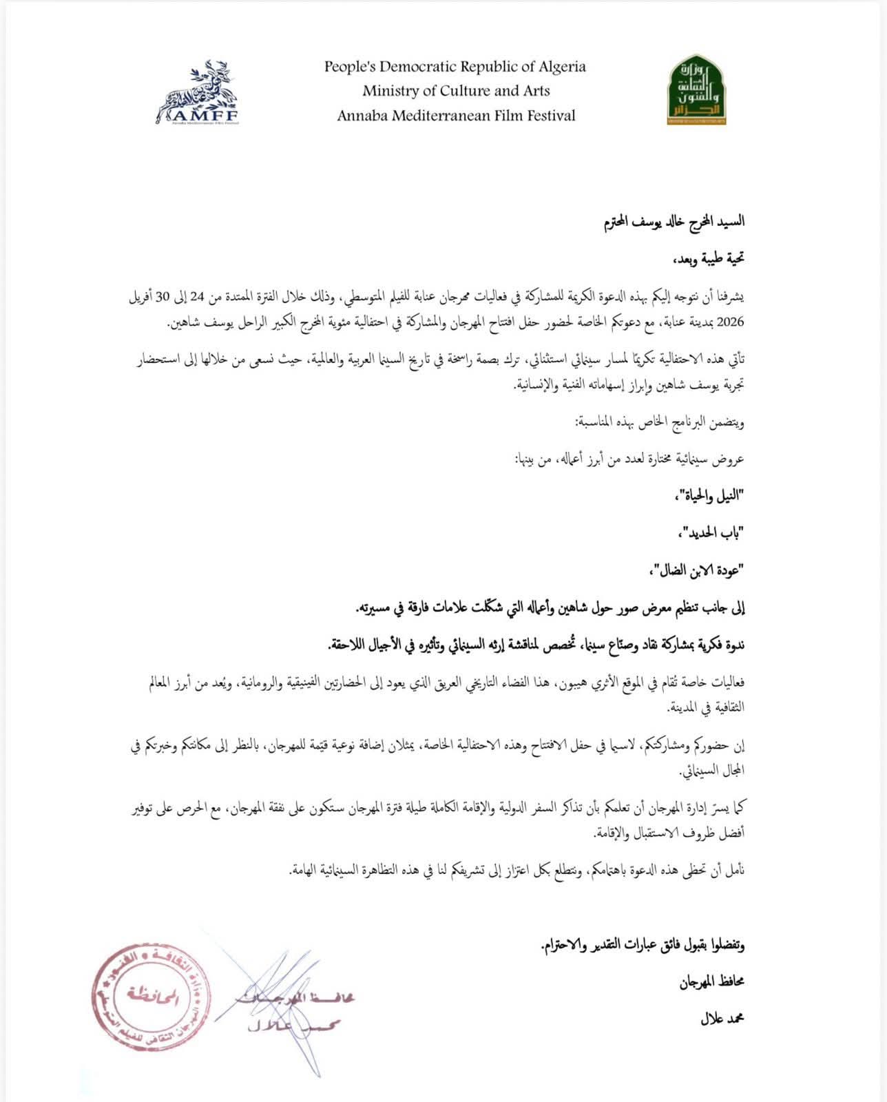 كما أشار إلى تلقيه دعوة ثانية من الناقد والمثقف الجزائري محمد علال، محافظ مهرجان عنابة السينمائي، لحضور دورة هذا العام التي تُقام خلال الفترة من 24 إلى 30 أبريل، والتي تحتفي بمئوية المخرج الكبير يوسف شاهين، وتُخصص السينما المصرية كضيف شرف للدورة.