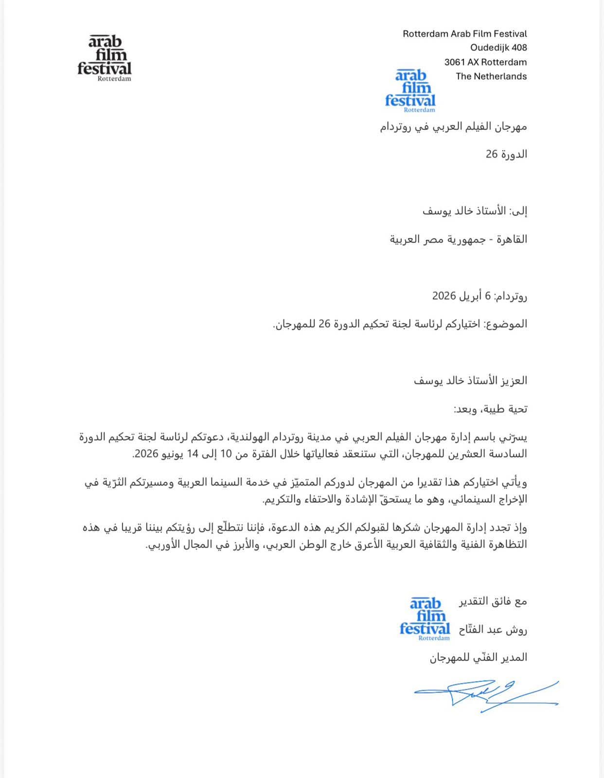 وأوضح يوسف أنه تلقى الدعوة الأولى من الدكتور خالد شوكات، الوزير والنائب التونسي السابق، والسينمائي السوري روش عبد الفتاح، المدير الفني لمهرجان روتردام بهولندا، وذلك للمشاركة كرئيس لجنة تحكيم المسابقة الرسمية خلال فعاليات المهرجان المقرر إقامتها في الفترة من 10 إلى 14 يونيو المقبل.
