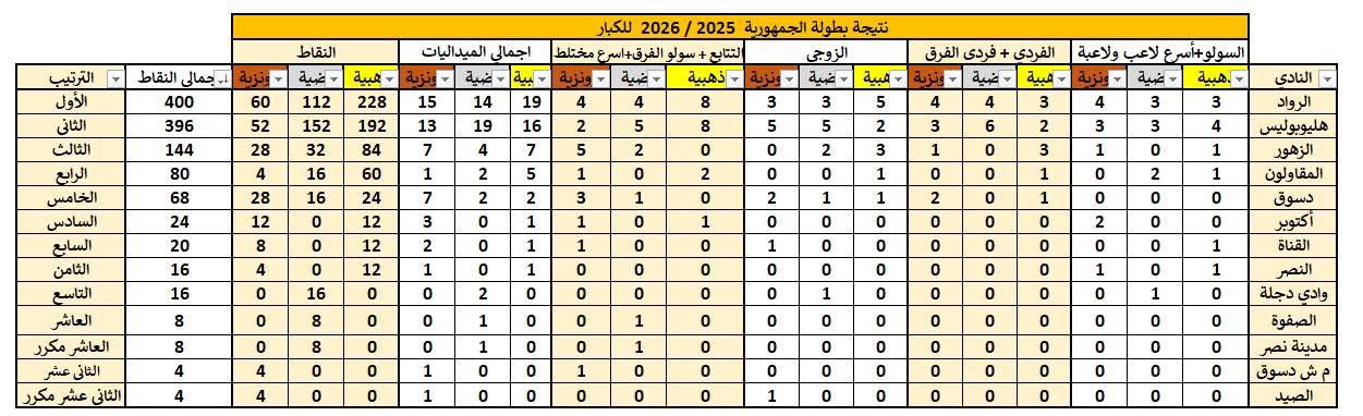 اختُتمت منافسات بطولة الجمهورية لكرة السرعة لموسم 2025/2026، وسط أجواء تنافسية قوية ومشاركة واسعة من الأندية، حيث نجح فريق الرواد في التتويج بلقب البطولة للمرة السادسة على التوالي، بعدما حصد 400 نقطة، متفوقًا بفارق 4 نقاط عن أقرب منافسيه، ليؤكد هيمنته على البطولة واستمراره في صدارة اللعبة.