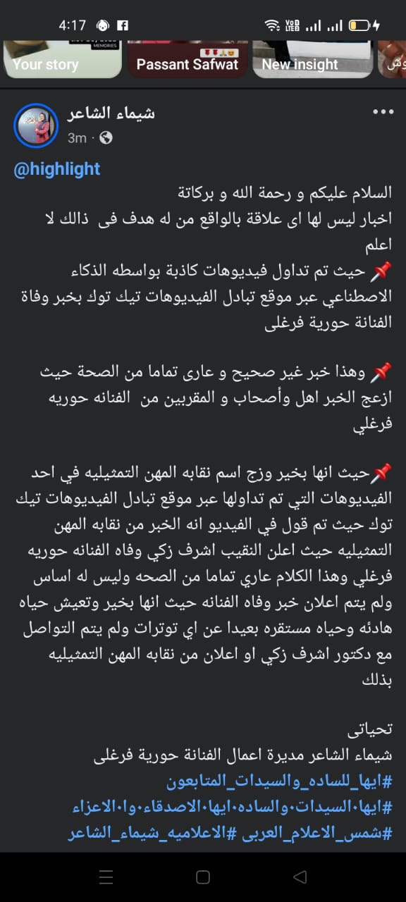 كما أُقحِم اسم نقابة المهن التمثيلية في أحد هذه الفيديوهات، حيث ادعى صانع المحتوى أن النقيب الدكتور أشرف زكي قد أعلن خبر الوفاة، وهو ادعاء باطل تمامًا ولم يصدر عن النقابة أو نقيبها أي بيان أو تصريح بهذا الشأن.